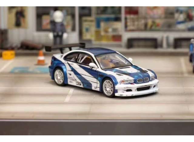 1/64 BMW E46 M3 GTR from Need for Speed *Manga* with opening hood and trunk, silver/blue